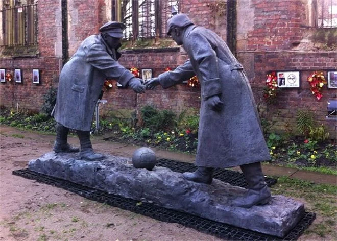 The story goes that in one location along the Western Front British and German troops were stationed in opposite trenches. On Christmas Eve some of the British soldiers heard the “enemy” singing carols and saw small Christmas trees on the other side. Then on Christmas day the soldiers from both sides met in what was referred to as “no man’s land” to exchange gifts and play football/soccer. In other words, the fighting was stopped for a brief period of celebration between the two sides which included a friendly sporting event. Upon its conclusion, the British and Germans went back to their own trenches and resumed the war.